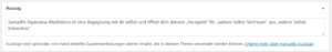 Unter dem Abschnitt „Auszug“ geben wir noch einen kleinen Teaser ein, der beim Mouseover in der Kalenderansicht erscheint. Bei wöchentlichen Terminen sollte dieser eine Angabe über die Laufzeit enthalten, zB „Das Hören der Lehren, Angeleitete Meditationen, Stilles Sein, Mantrachanting, Fragen und Antworten aus dem Herzen sind die tragenden Elemente dieser Schulung des Herzens und des Geistes. Zehn Mittwochabende vom 23.03. bis 25.05.“ – Bei Wochenenseminaren wird „Kurs XX – “ (mit XX = laufende Nummer) an den Anfang des Teasers gestellt.