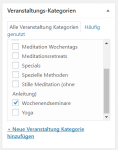 Jede Veranstaltung(-sserie) muss mindestens einer Kategorie zugeordnet sein und mindestens alle passenden Wochentage als ‚Tag‘ tragen. Die anderen ‚Tags‘ helfen bei der Erstellung der Listen auf den Unterseiten und sollen natürlich gesetzt sein, wo es passt. Ich habe versucht die folgende Liste möglichst eindeutig zu gestalten, wenn es Unklarheiten gibt: Mail an webseite@buddhahaus-muenchen.de / Xaver.