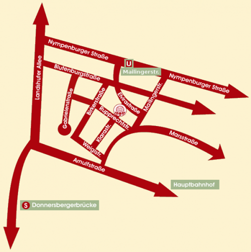 Unser Zentrum liegt im Stadtviertel Neuhausen und ist gut mit öffentlichen Verkehrsmitteln (U-Bahn U1, Haltestelle Maillingerstraße oder S-Bahn Donnersbergerbrücke) zu erreichen. Der Eingang ist vorne an der Straße.